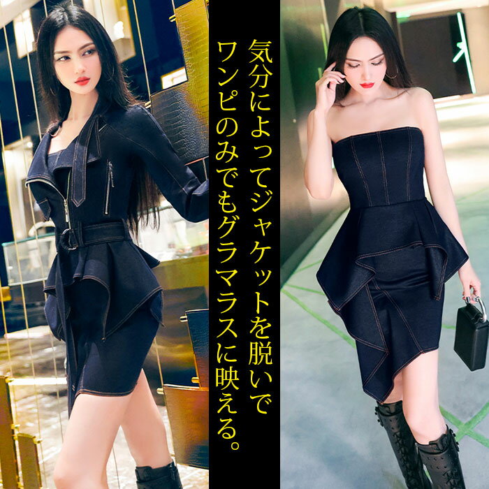 [限定50%offクーポン配布]ワンピース セットアップ アンサンブル ジャケット 長袖 ショート ミニ タイトミニ きれいめ セクシー 色気 クラブ スナック キャバ ドレス 30代 40代 デニム デート カジュアル 可愛い 衣装 トレンド 韓国 ファッション 服 ネイビー 上下セット
