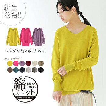 【全品送料無料】9/12(月)12:59迄【新色登場】選べるM〜5Lサイズ展開『n'OrLABELゆるやかVネックシンプル綿ニット』[ニット レディース トップス 長袖 Vネック 綿100% コットン 無地 体型カバー 綿ニットシリーズ]【メール便不可】
