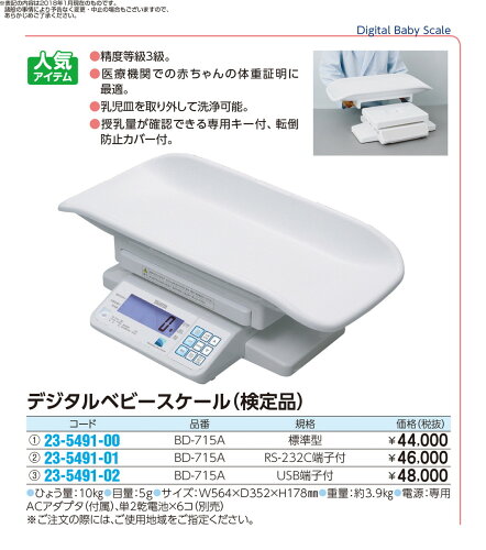 【病院専用商品】デジタルベビースケール(検定品) BD-715A品番 23-5491-00151入り 医療機器対象外 専門科目 産婦人科・小児科 定価\44000 JAN 4904785005457 ●商品説明 ●精度等級3級。