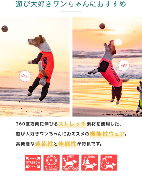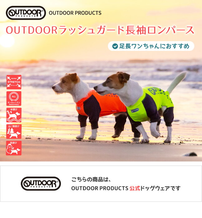 詳細 素材 ポリエステル88% ポリウレタン12% 詳細 OUTDOOR PRODUCTS公式ドッグウェア 遊び大好きワンちゃんにおススメの機能性ウェア オールシーズン・水遊び・山遊び・雪遊び ポリエステル素材を採用し高機能な速乾性と伸縮性 アクティブな蛍光カラーでおしゃれ 裾にゴム入りでフィット感を高め、調整も可能。